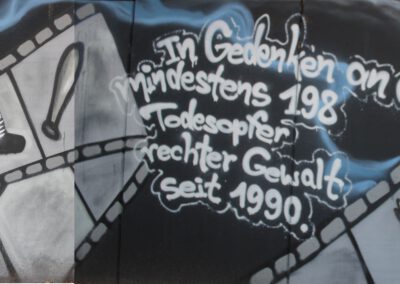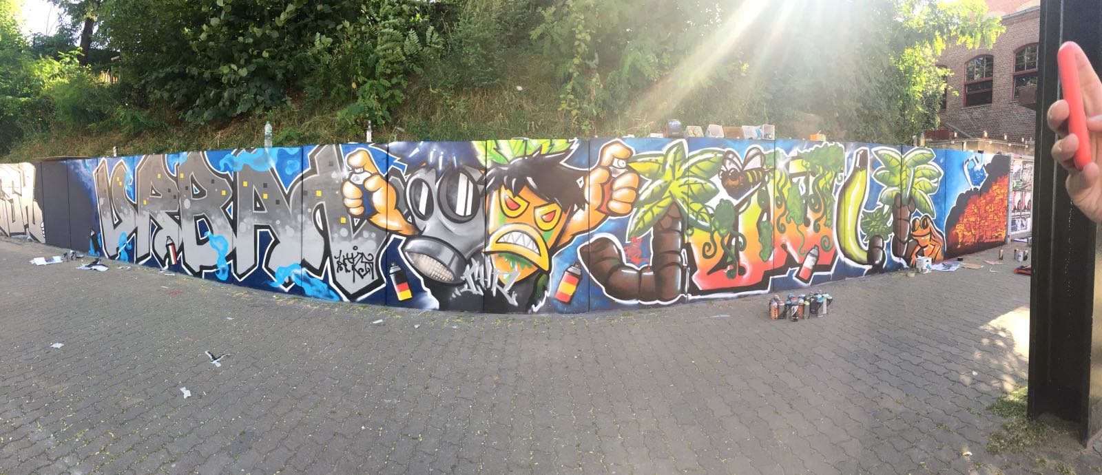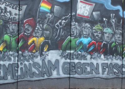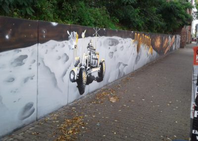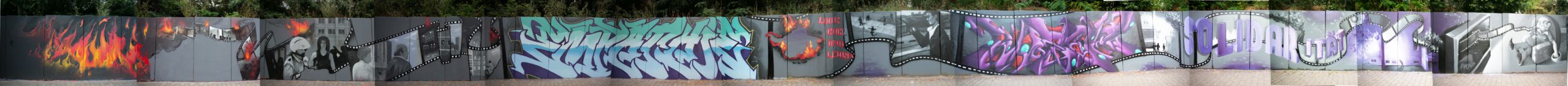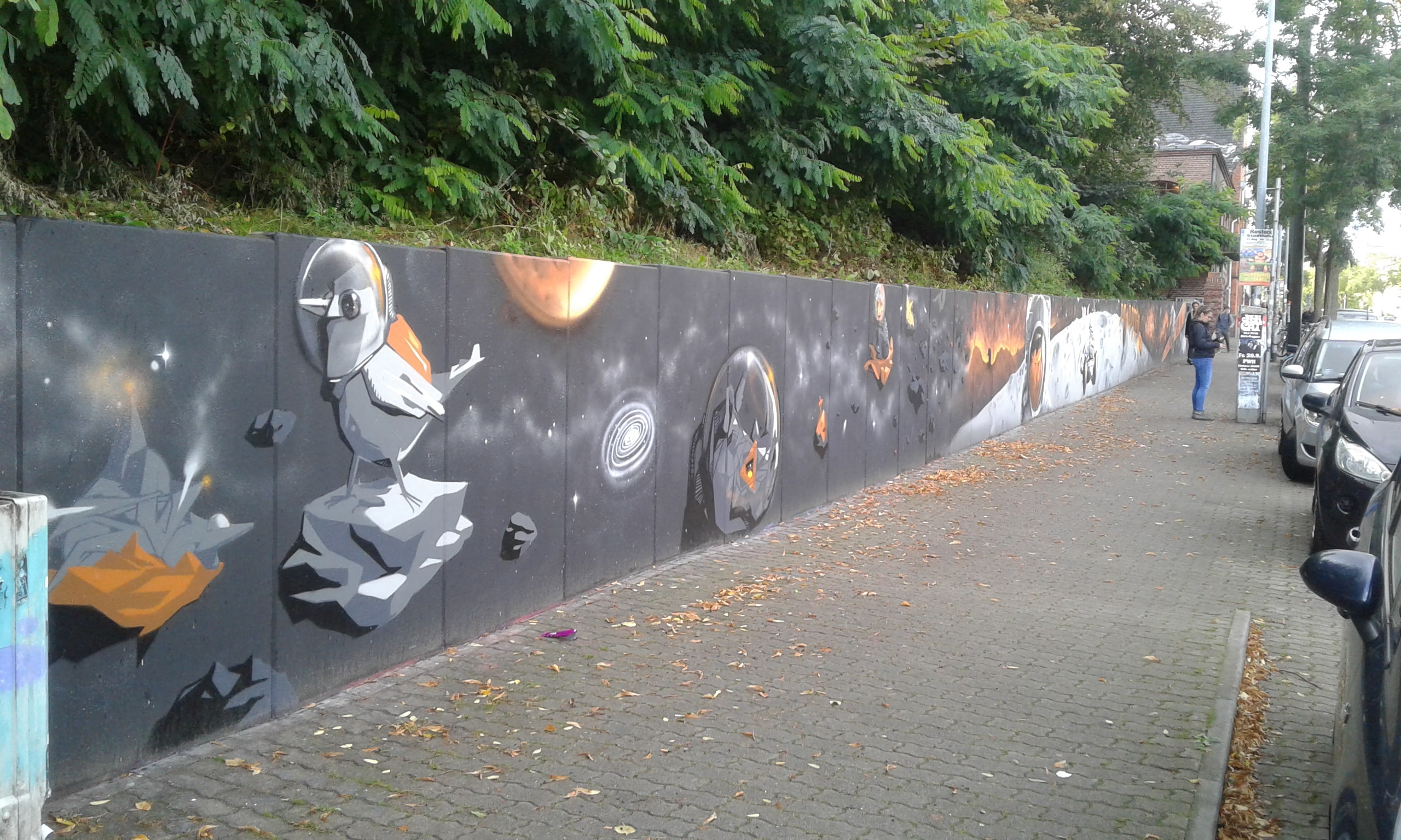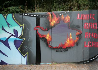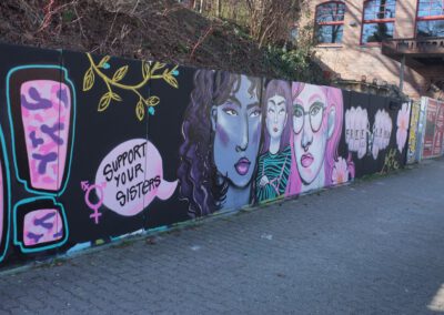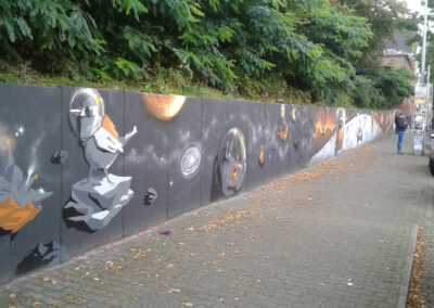 Die Hangmauer wird seit 2018 als Graffiti–Wand gestaltet, die ein künstlerischer Freiraum ist. Wir freuen uns über eine regelmäßige Gestaltung. Ein respektvoller Umgang sowie die Einhaltung folgender Regeln ist Voraussetzung für die Nutzung der Hanghauer: Achtet auf euren Müll und entsorgt ihn. Malt nur auf der freigegeben Wand. Gehweg, Laternen und Stromkästen gehören nicht dazu. Verzichtet bitte auf Bitumen und ähnliche ölhaltige Anstriche, diese beschädigen die Wand. Selbstreflexion und Fingerspitzengefühl sollten stets darüber entscheiden, ob ein Bild übermalt wird. Das neue Werk sollte ähnlich aufwendig und flächenmäßig verteilt sein, wie das alte. Also zB. keine Taggs, Throw Ups und Bombings über aufwendige Pieces. Bitte nehmt euch und euer Bild nicht zu wichtig, andere Menschen können auch sprühen. Wer gerne länger etwas von seinem Bild haben möchte, fotografiert es. Wir bitten euch großformatige thematische Bilder und Kunstwerke, welche die gesamte Wand einnehmen, besonders zu respektieren. Diese werden entsprechend gekennzeichnet. Die Hangmauer ist kein Ort für diskriminierende, menschenverachtende oder gewaltverherrlichende Botschaften sowie kein Raum für kommerzielle Werbung oder Wahlkampf. Alle weiteren Infos und Zeiträume für geplante großformatige Bilder, in denen die Mauer nicht freigegeben ist, findet Ihr hier auf der Webiste. Vielen Dank an alle Künstler*innen, die bisher dazu beitrugen, dass das Konzept so funktioniert .