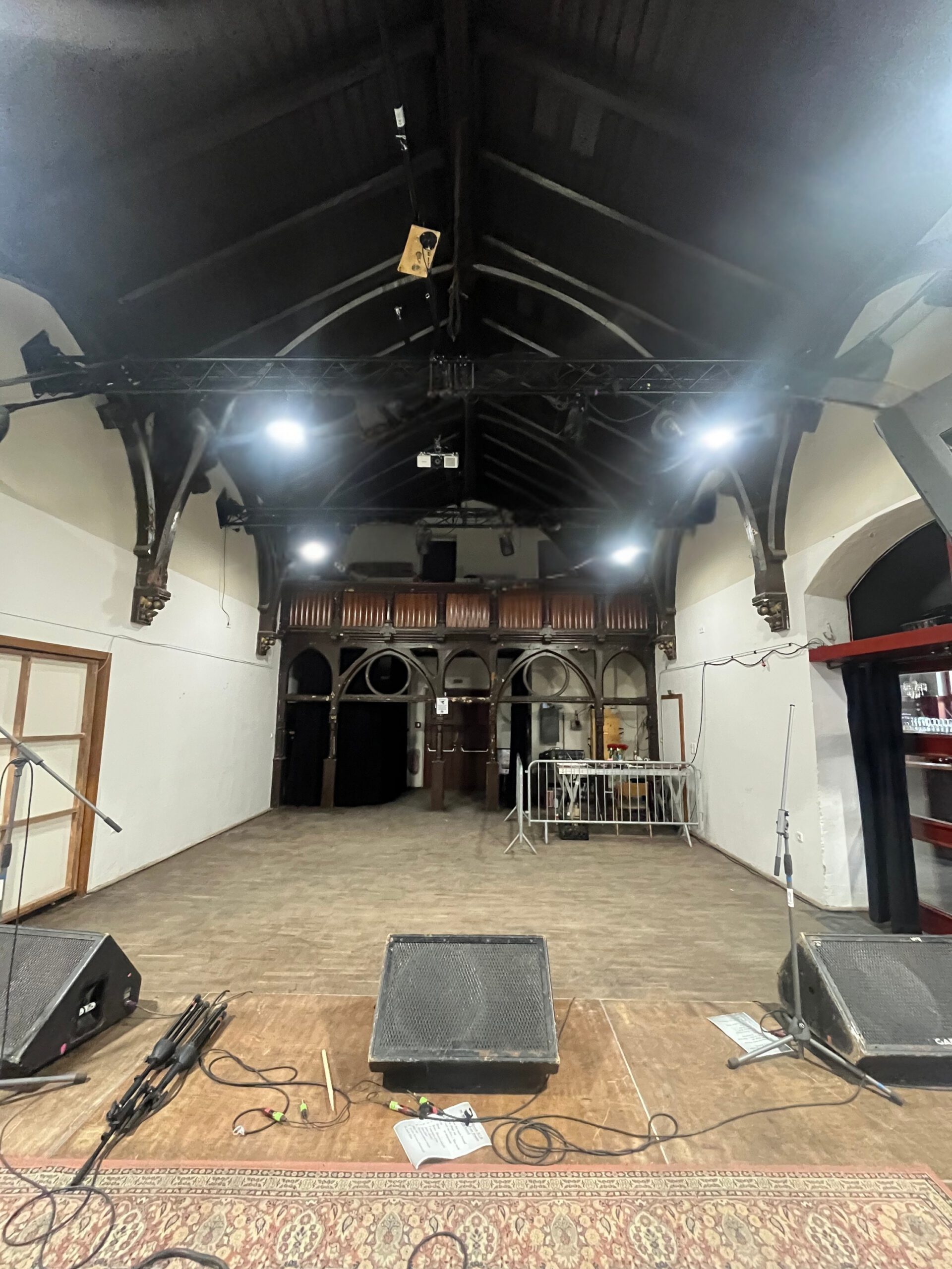 Der doppelgeschossige Saal mit innen sichtbarer Deckenkonstruktion im neogotischen Stil wurde vom Architekten Gotthilf Möckel geschaffen. Bereits von der Straße ist sein unverkennbarer Staffelgiebel zu sehen.