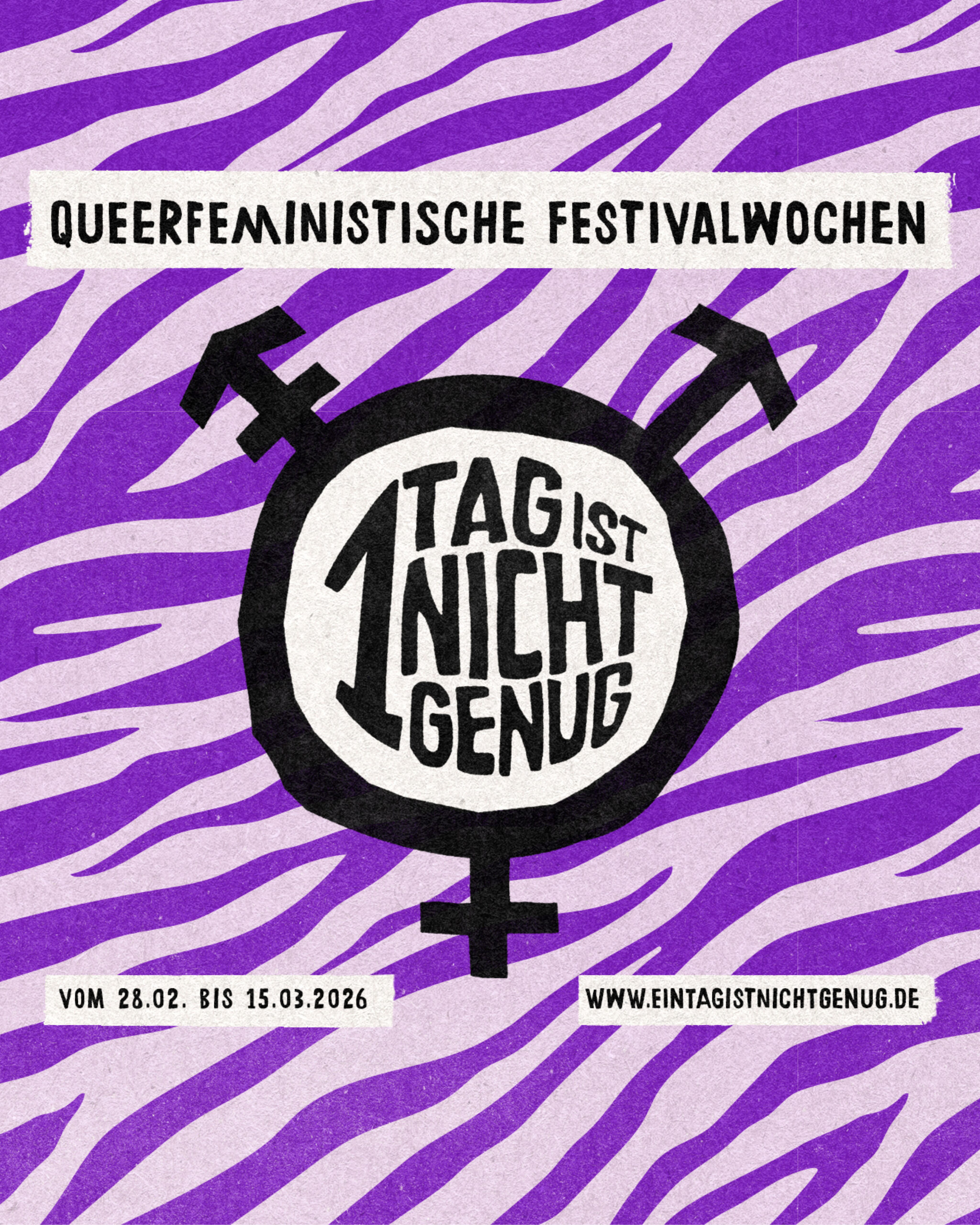 Der Internationale Feministische Kampftag am 8. März dient dem Peter-Weiss-Haus e.V. und seinen vielfältigen Kooperationspartner:innen auch im Jahr 2026 als Anlass, unter dem Motto Ein Tag ist nicht genug die Queerfeministischen Festivalwochen in Rostock zu feiern. Euch erwartet ein viefältiges Programm mit Lesungen, Workshops, Talks, Vorträgen, DJ-Sets, Filmvorführungen, Partys und Raum für Begegnungen und Austausch.