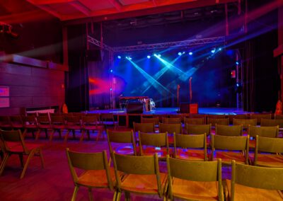 • Verdunkelungsmöglichkeit durch Bühnenvorhänge