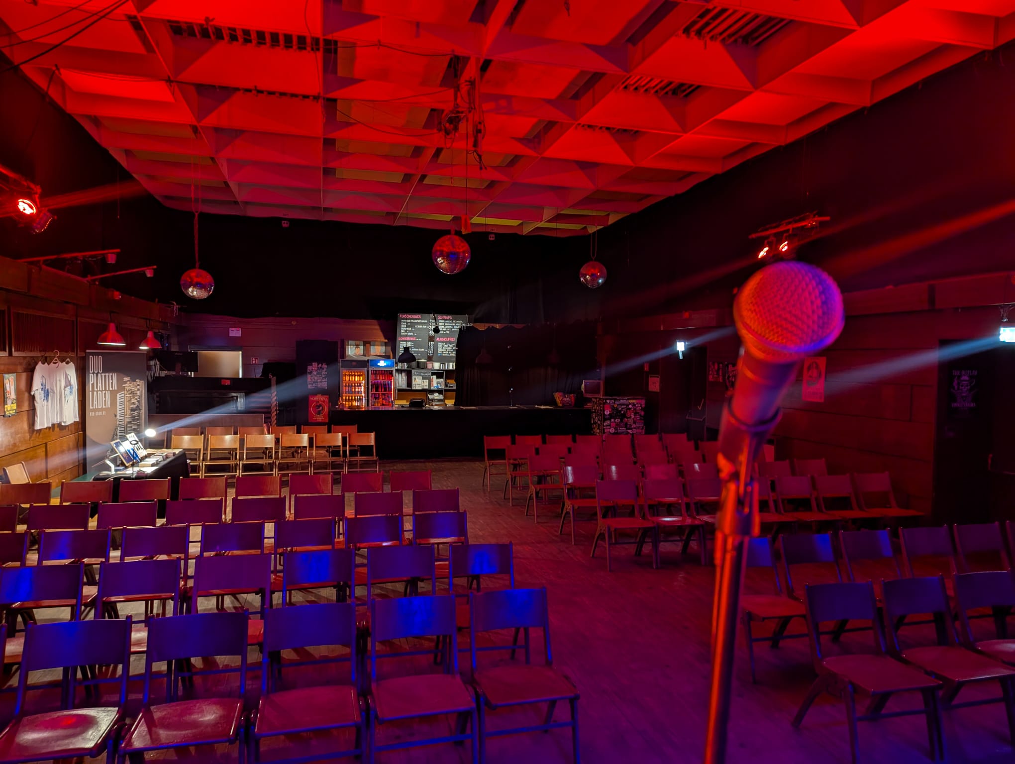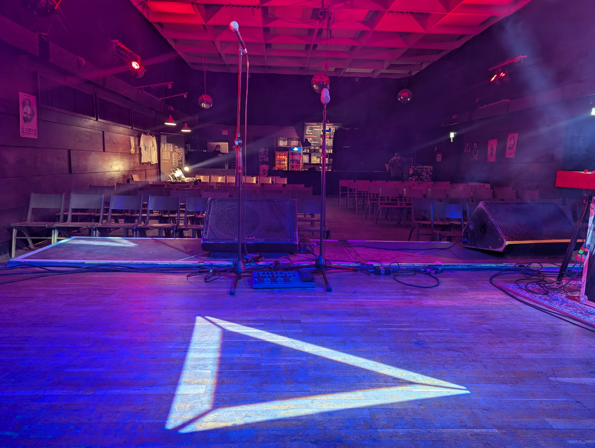 Der Saal ist mit einem Veranstaltungstresen ausgestattet, welcher von der Subraum eG betrieben wird. Die Verköstigung der Gäste mit Getränken und Speisen, sowie verschiedene Cateringoptionen können über uns hinzugebucht werden. Bei Bedarf kann der Tresen-Bereich jedoch auch mit einem schwarzen Bühnenvorhang zugezogen und somit visuell abgetrennt werden.